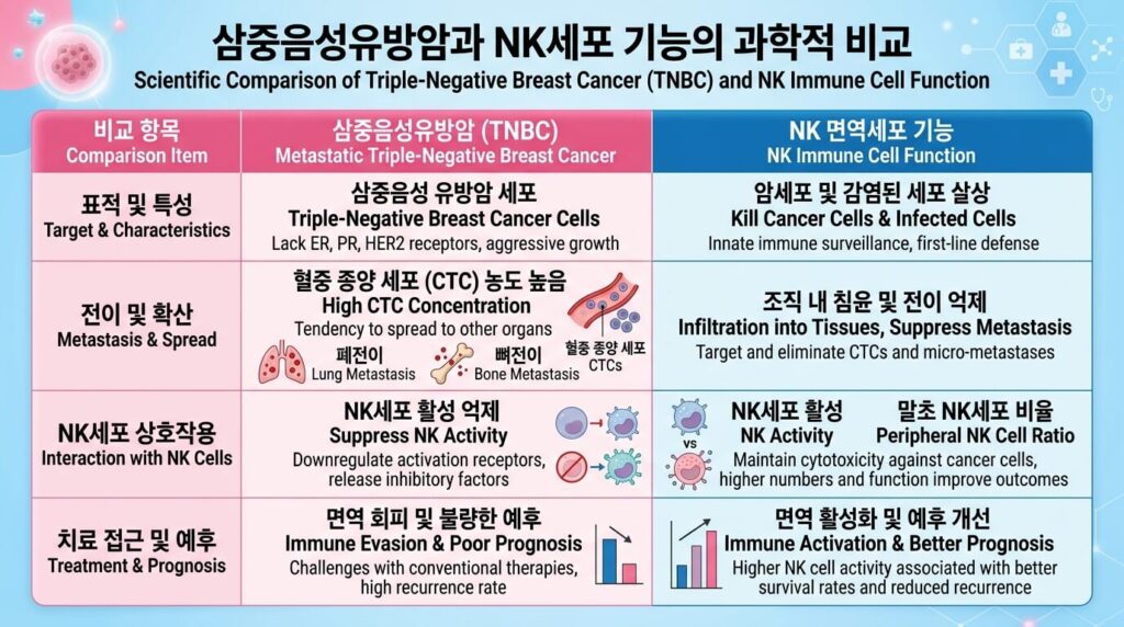 삼중음성유방암은 예후가 상대적으로 까다롭고, 폐전이·뼈전이처럼 다른 장기로 전이가 진행된 경우 면역 상태의 중요성이 더 커집니다. 연구에서도 순환종양세포와 NK면역세포 비율을 함께 볼 때 예후 판단에 도움이 되는 결과가 보고되었습니다.